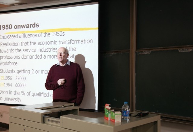 在一个多小时的讲座中,Gerry Hayden 博士首先介绍了西方高等教育的成长和发展史,其次,介绍了西方大学的入学要求,当他谈到西方大学的教学及学生生活特色时,一些学生不禁流露出对于国外学习机会的向往。讲座期间,Gerry Hayden 博士举例对于诺森比亚大学一流的遍布校园的自动化环境设施以及丰富的教学形式作了详细的介绍。当一张张充满英伦校园风情的图片呈现的时候,学生们的心中也徜徉着美好的期待,抑制不住的欢声与讨论暗自涌开。讲座临近尾声,一些热情的学生更是积极地围着Gerry Hayden博士,纷纷表达了自己对于国外学习生活浓厚的兴趣。