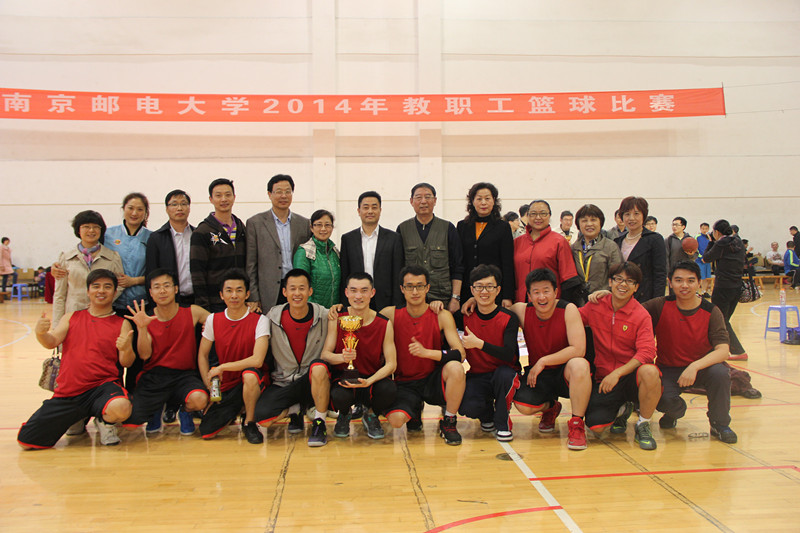 由南京邮电大学工会组织的2014年教职工篮球比赛,经过为期两周的小组循环和交叉淘汰的奋力角逐,机关篮球队和通达篮球队分别以上、下半区第一名的成绩进入决赛。4月18日下午,南邮仙林体育馆内人声鼎沸、热闹非凡,翘首期盼的师生怀着激动的心情前来观看这场巅峰对决。主席台上一顺排列着熠熠闪光的八个奖杯,副校长张志华、工会主席彭洋、体育部主任薛雨平等领导亲临赛场观摩,我院党委副书记王立辉,院长助理甘宗盛、卞文献,工会主席余素兰率领通达师生临场助阵。