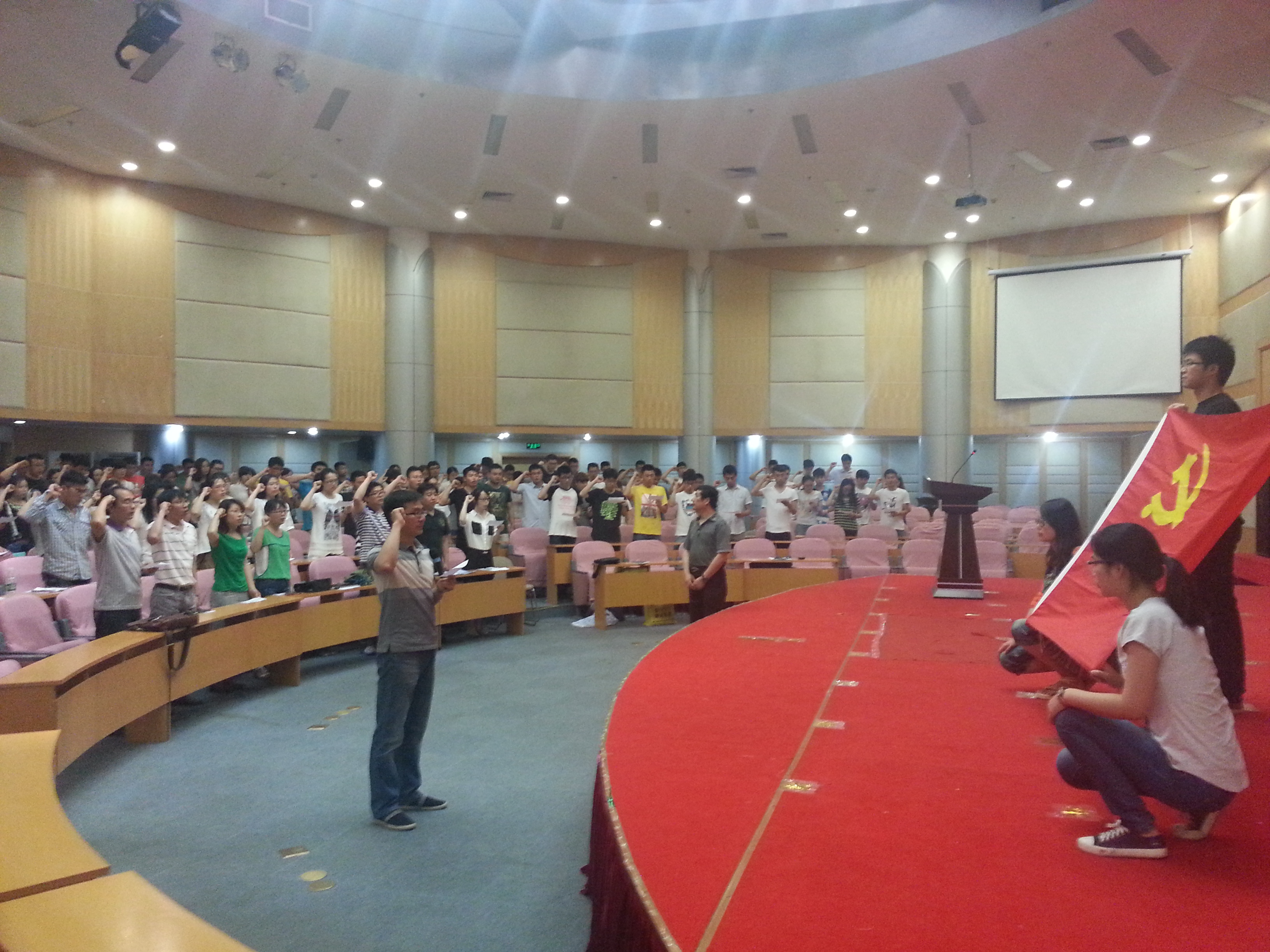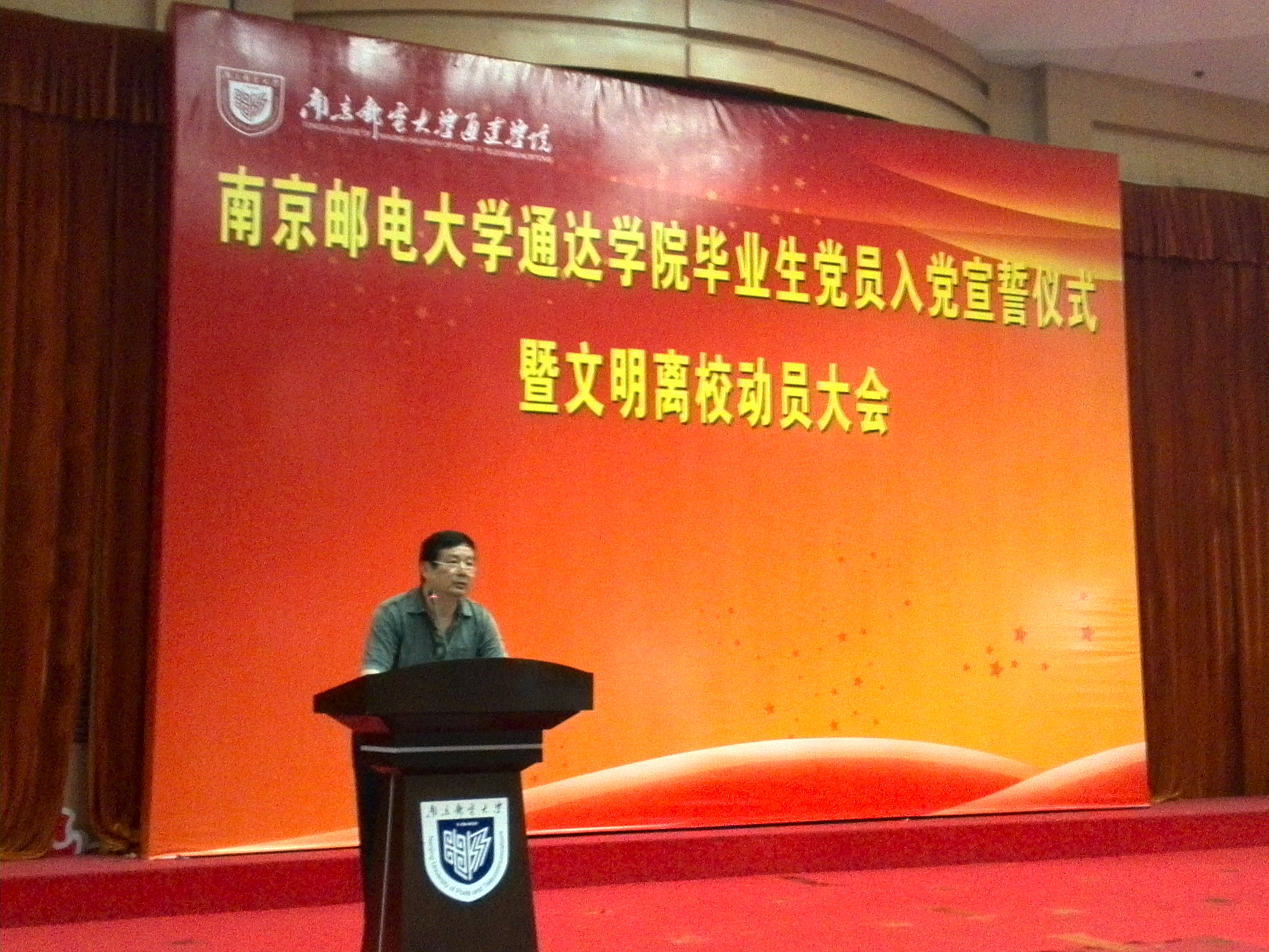2014年6月10日下午,南京邮电大学通达学院2014届毕业生新党员宣誓老党员重温入党誓词暨文明离校动员大会在三牌楼校区科学会堂二楼报告厅举行。南京邮电大学通达学院党委书记成际镇出席了大会,2010级全体辅导员老师、组织干事和321名毕业生党员参加了大会。