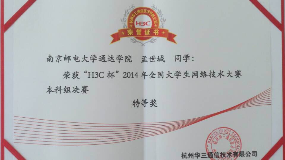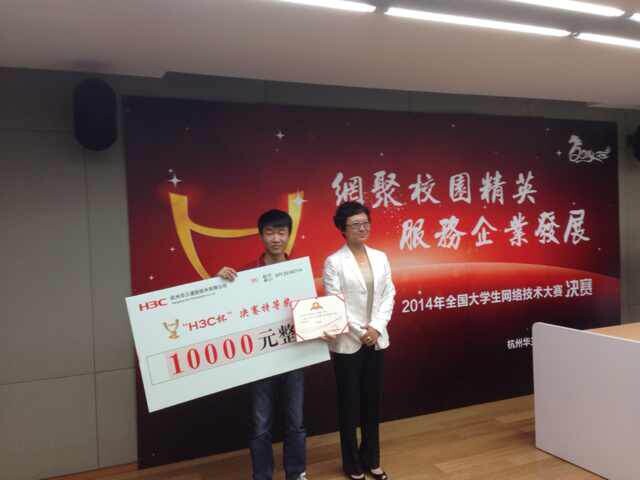 2014年7月13日下午,2014年“H3C杯”全国大学生网络技术大赛决赛在杭州H3C公司总部举行,我院2011级通信工程(嵌入式系统开发)专业孟世成同学以全国第二,江苏省第一的成绩晋级本次总决赛。经过激烈紧张的角逐,孟世城同学获得了全国唯一的特等奖,为学院争得了荣誉。