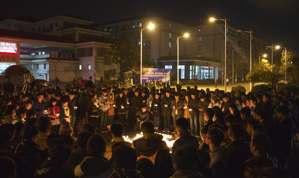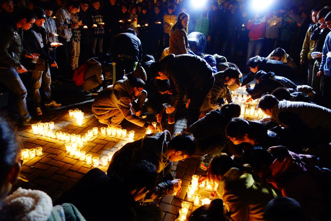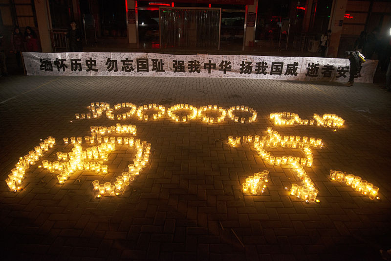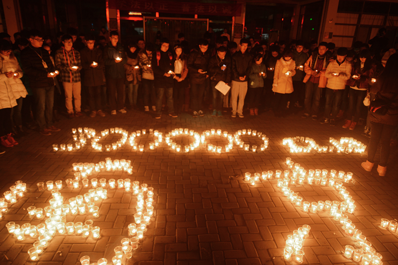 2014年12月13日晚,我院学生在学院广场举行了“南京大屠杀遇难同胞烛光祭”活动。学生会成员用蜡烛在地面上摆出“300000 12.13 南京”的字样,500只红烛依次被点亮,整个祭奠活动气氛庄严肃穆。我院学生会等学生团体成员及自愿而来的学生共200多人参加了此次活动。