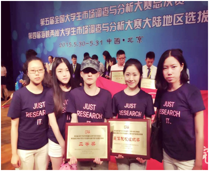 5月31日,由教育部高等学校统计学类专业教学指导委员会与中国商业统计学会共同主办的“2015年第五届全国大学生市场调查与分析大赛总决赛暨第四届海峡两岸大学生市场调查与分析大赛大陆地区选拔赛”在北京对外经济贸易大学落下帷幕。我院由谭萍为指导老师,雷天、郝婷、吴琴、冯煜惠、周丽雪组成的队伍作为江苏省分赛区的代表队之一,凭借新颖的选题、高质量的调查报告、出色的现场陈述和PPT展示获得二等奖的好成绩。我院荣获“最佳院校组织奖”。