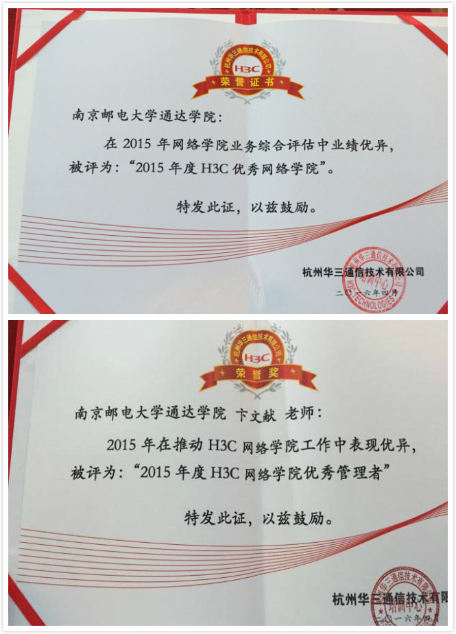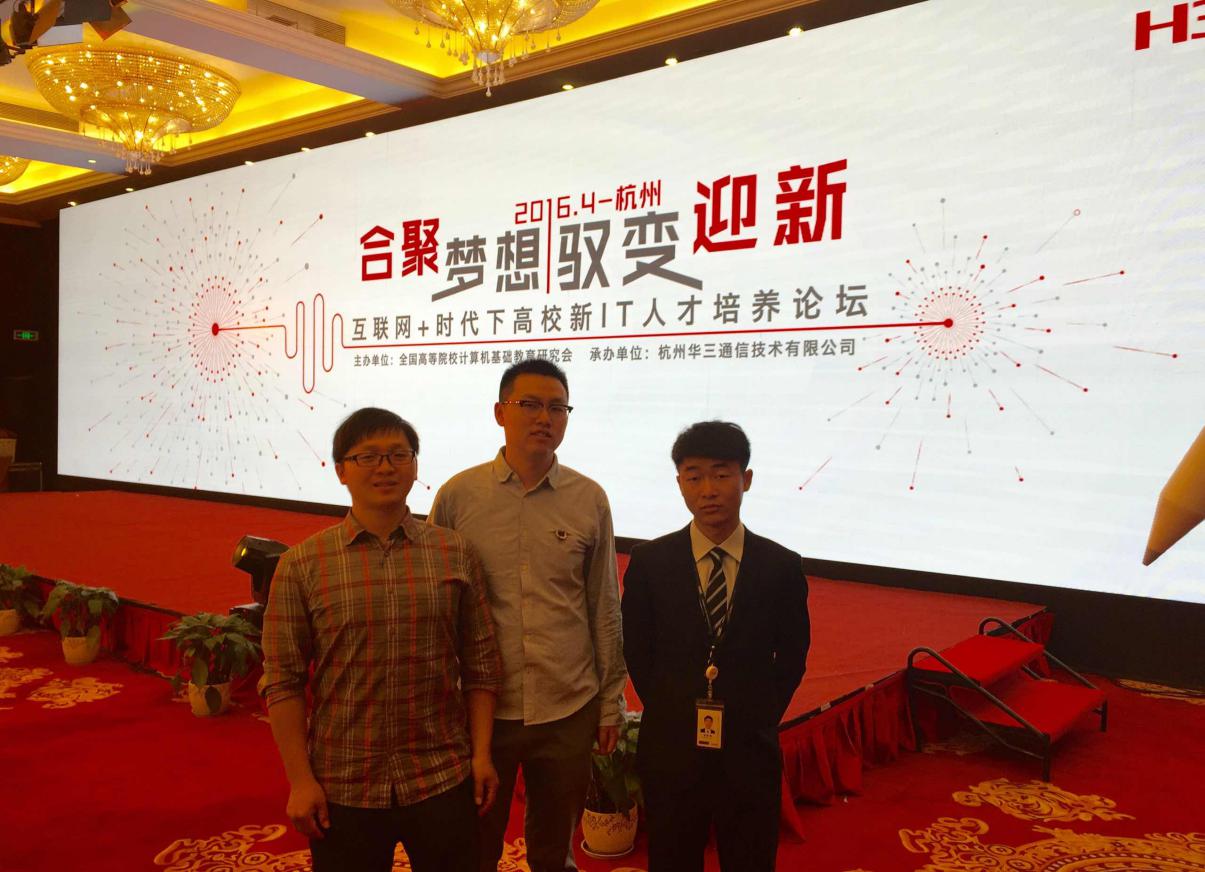 日前,我院姚永明、徐永华老师参加了在杭州召开的由全国高等院校计算机基础教育研究会主办、杭州华三通信技术有限公司承办的“互联网+时代下高校IT人才培养论坛”。会上对2015年度H3C优秀网院进行了表彰。凭借出色的教学质量和学生技能竞赛成绩,我院从500余所H3C网络学院中脱颖而出,获评“2015年度H3C优秀网络学院”。此外,卞文献老师荣获“2015年度H3C网络学院优秀管理者”称号。