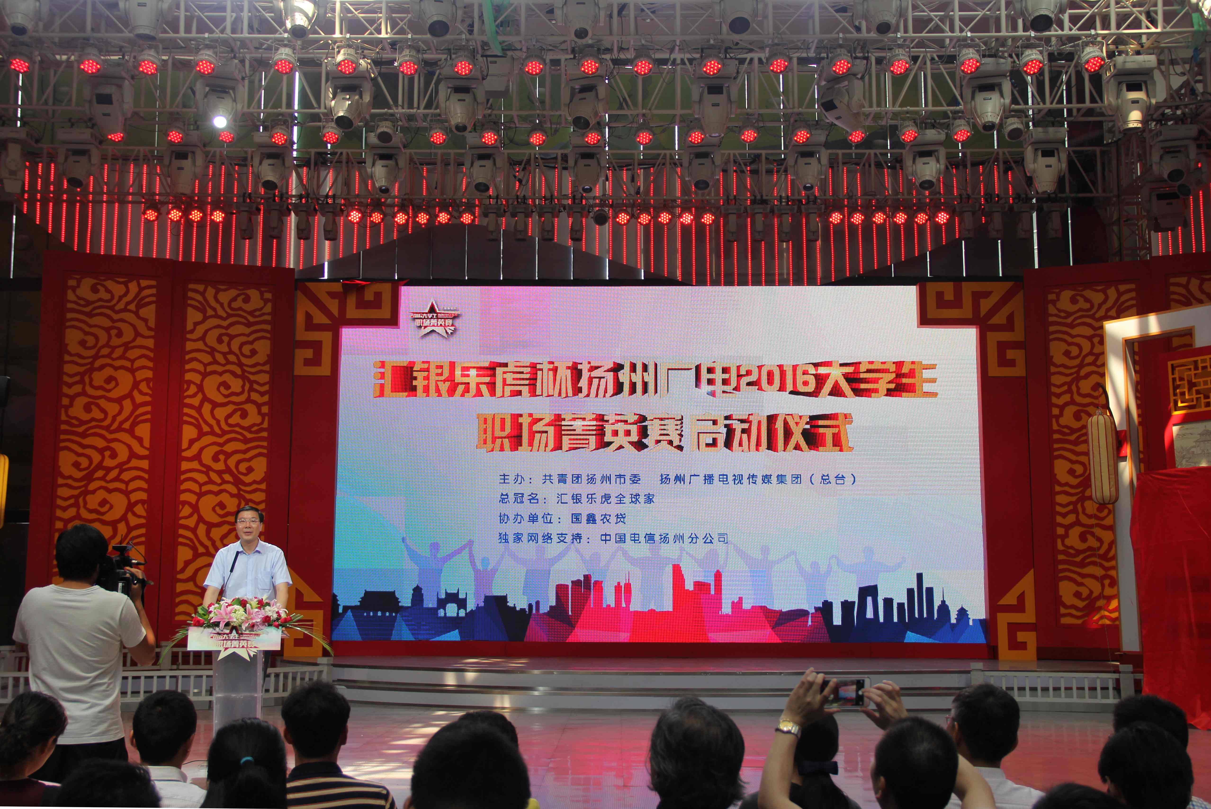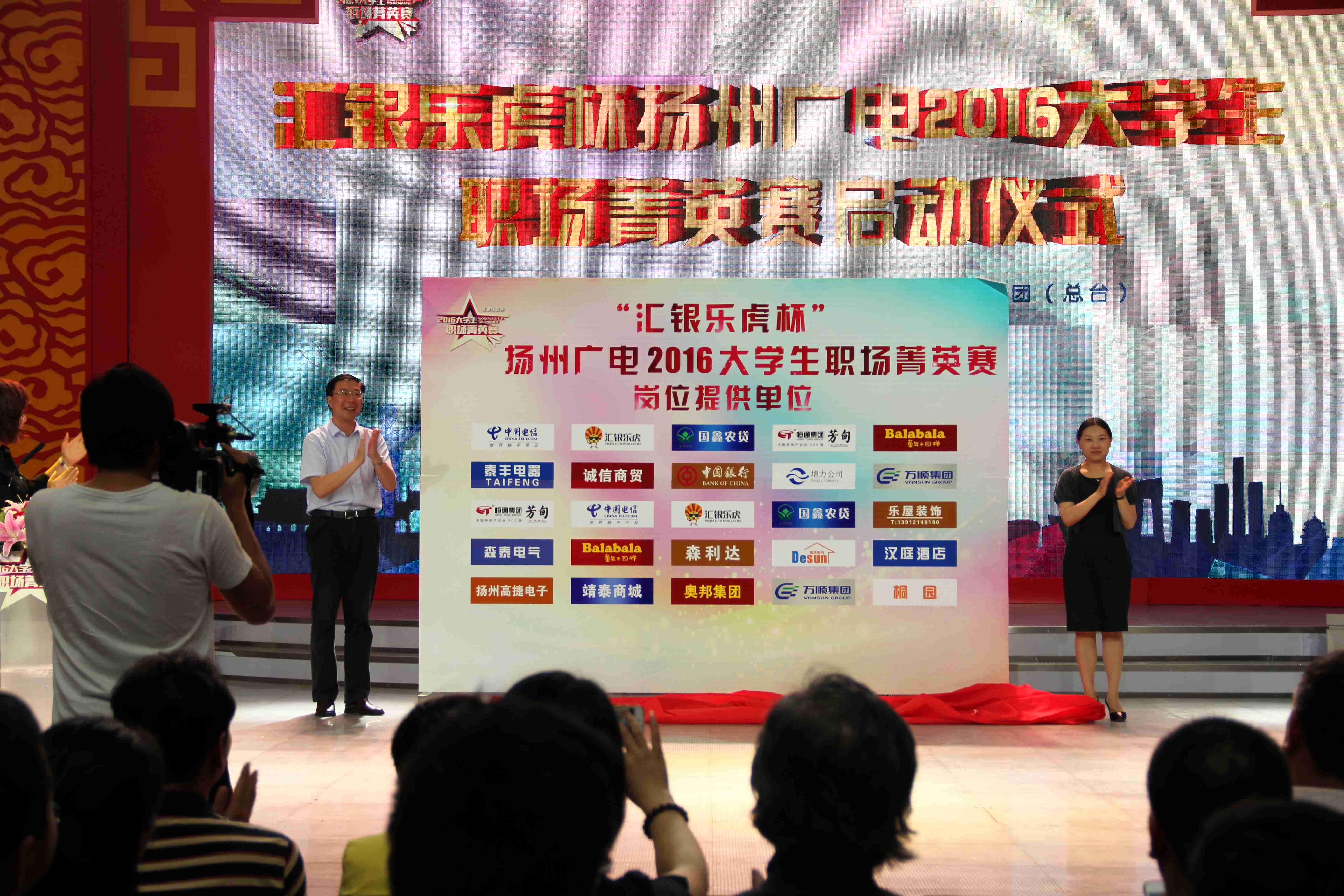 6月23日上午,在扬州广电总台大厅举行了“汇银乐虎杯”扬州广电2016大学生职场菁英赛启动仪式。我院党委书记戴兆骏、团委书记解厚荣以及30名学生代表参加了此次活动。