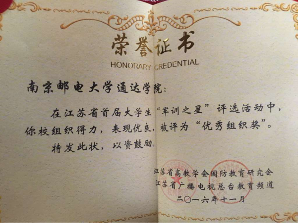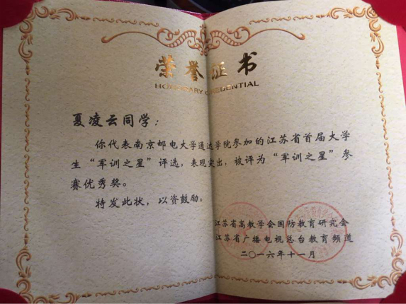 为提升江苏高校学生军训育人质量,今年9月20日,由江苏省教育厅主办,省高教学会国防教育研究会和省广播电视总台教育频道联合承办,组织开展了江苏省首届大学生“军训之星”评比。接到比赛通知后,学校立即组织推荐优秀选手,经过对军容军姿、军事技能、普通话、舞台形象等综合选拔,最终确定我院2016级学生夏凌云代表学校参加全省首届大学生“军训之星”评比。在电视决赛现场,夏凌云同学表现出色,获得了现场演讲和军事技能展示的好成绩,综合网络投票得分,最终获评江苏省首届大学生“军训之星”优秀奖。