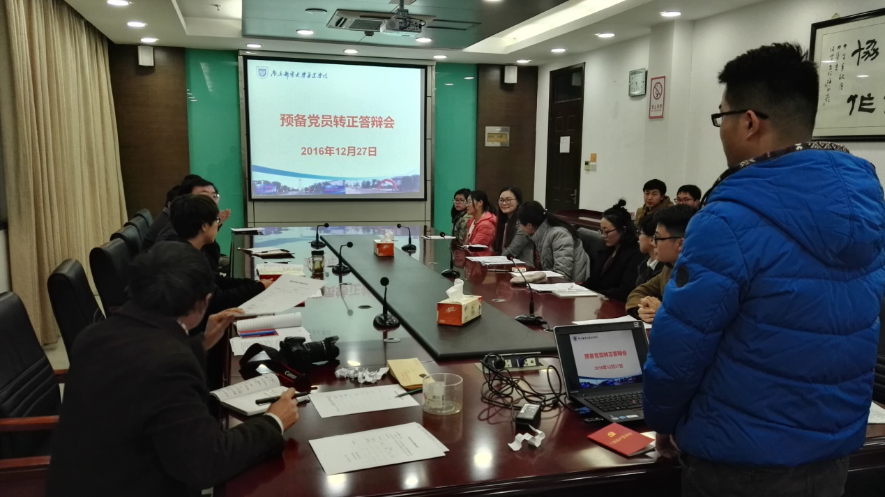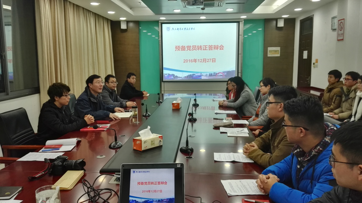 12月27日下午,学院2016年第六次预备党员转正答辩会在行政楼十楼会议室举行。此次答辩评委由党委委员、支部书记、年级辅导员等7人组成,院党委书记戴兆骏为组长。22名预备党员参加了答辩会。