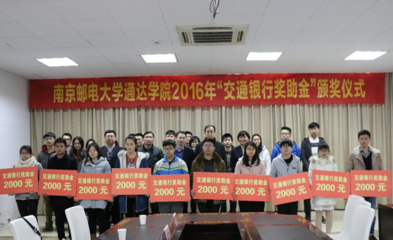 12月29日下午,南京邮电大学通达学院“扬州交行奖助金”颁奖仪式在大学生活动中心举行。交通银行扬州分行副行长纪玉成,我院院长宗平,党委副书记王立辉,交通银行扬州分行营业部总经理高新嬴,副总经理江源,学生工作处、辅导员和获奖学生参加了颁奖仪式。仪式由学生工作处副处长解厚荣主持。