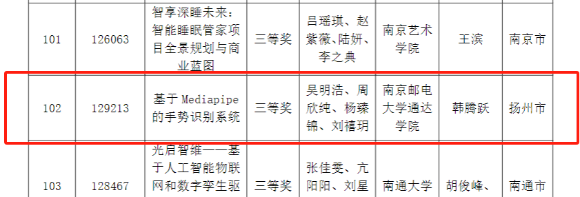 本届大赛以“人机协作”命题,共吸引全省64所高校参赛,复赛项目总计166项。经过初审、作品陈述、评委问辩环节,由我院吴明浩、周欣纯、杨臻锦、刘禧玥四名同学共同参与,韩腾跃老师指导的作品《基于Mediapipe的手势识别系统》荣获大学组“三等奖”。