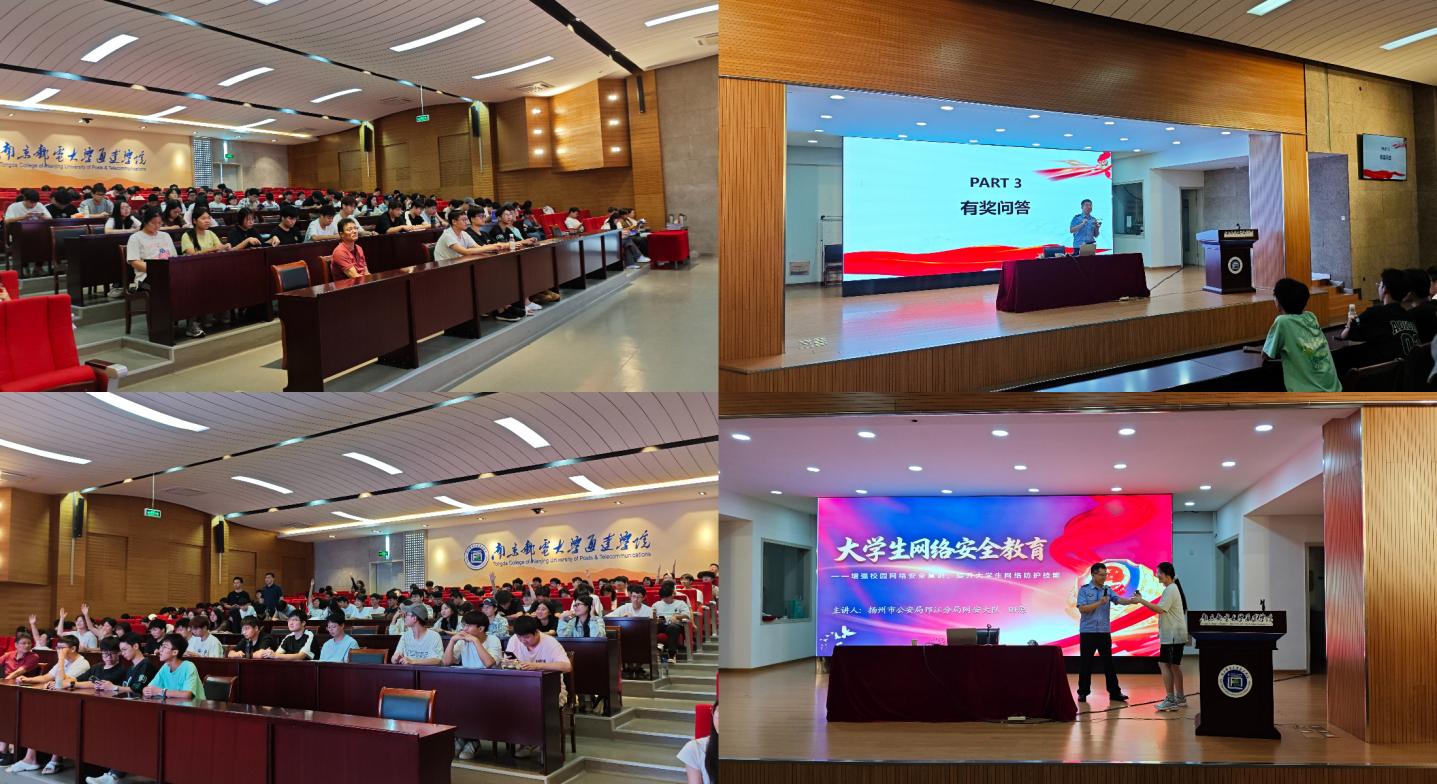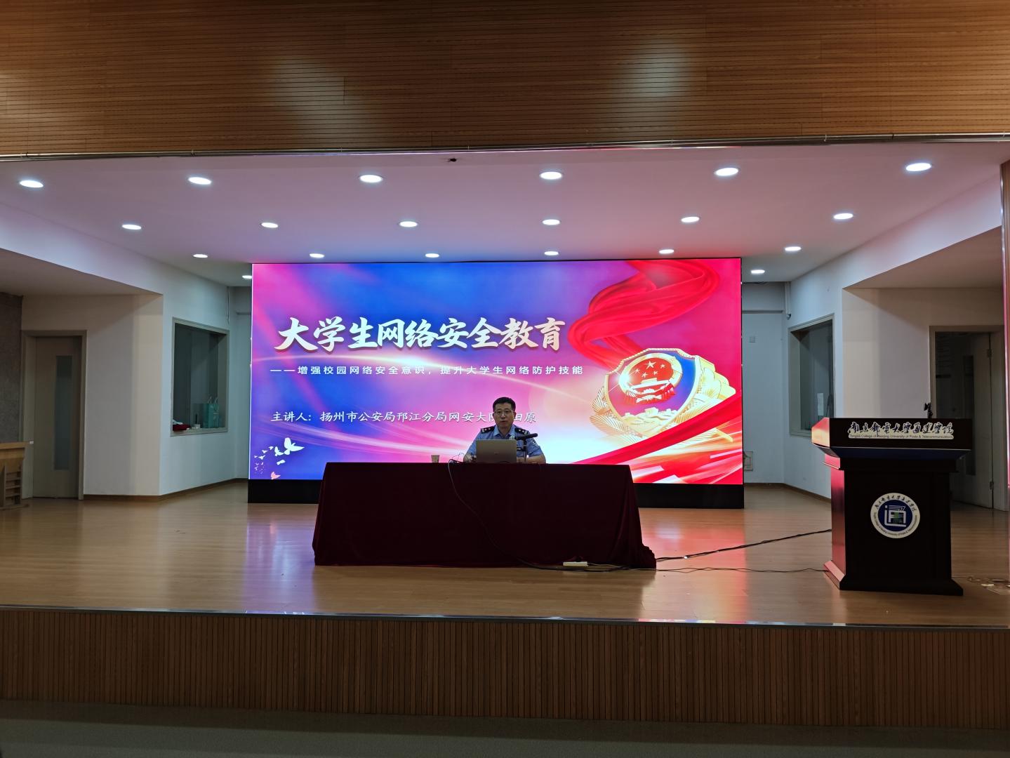 为强化大学生网络安全素养,深化警校协同治理机制,9月29日,学院产学研合作与实验室建设处联合扬州市公安局邗江分局网安大队举办“网络安全进校园 警校共筑防火墙”专题教育讲座。网安大队副大队长田原主讲,副院长张伟出席活动,近300名学生参与。