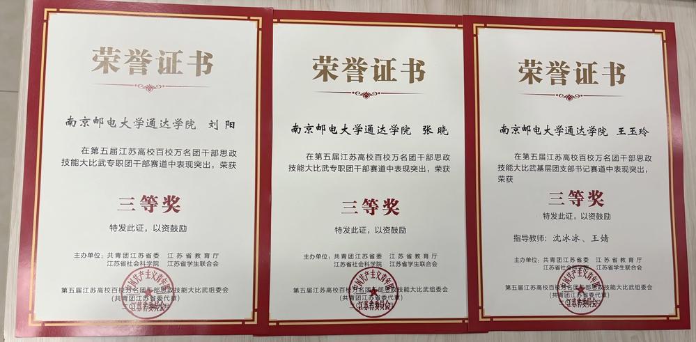 近日,第五届江苏高校百校万名团干部思政技能大比武比赛结果公布,学院刘阳老师和张晓老师荣获专职团干部专项赛三等奖,王玉玲同学荣获基层团支部书记专项赛三等奖,他们为学院赢得了荣誉,同时也充分展现了我院思政教育的丰硕成果与师生的良好精神风貌。