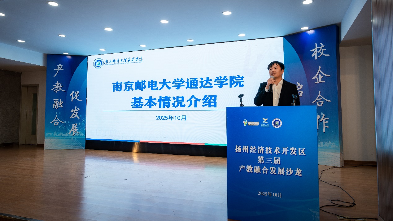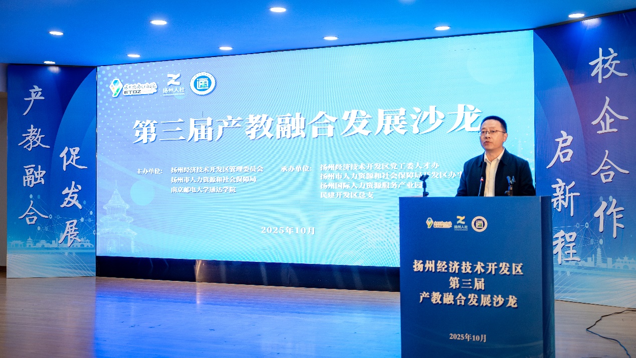 10月29日,扬州经济技术开发区在学院实验楼报告厅举办第三届产教融合发展沙龙,共商政校企合作新篇章。扬州市人社局党委委员、副局长王锦程,扬州经济技术开发区党工委委员、管委会副主任赵海涛,扬州经济技术开发区国有控股(集团)有限公司党委副书记、总经理李政,扬州市人力资源和社会保障局开发区办事处主任赵志沛,扬州经济技术开发区组织部人才处处长张林,南京邮电大学通达学院院长沈建华、副书记兼副院长刘伟,扬州大学、扬州职业技术大学、扬州工业职业技术学院、江苏旅游职业学院等在扬高校招生就业处负责人,30家经开区重点企业人力资源负责人以及200多名学生代表出席了活动。