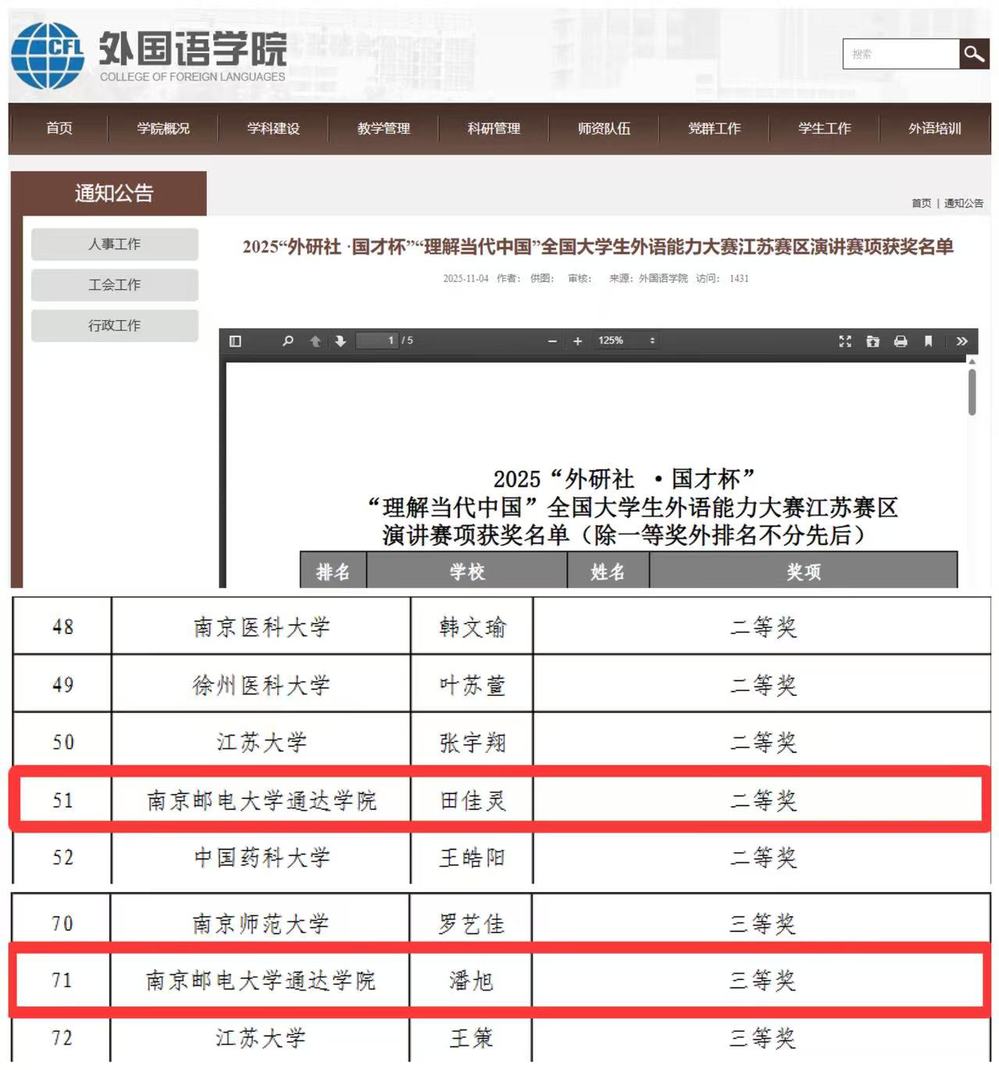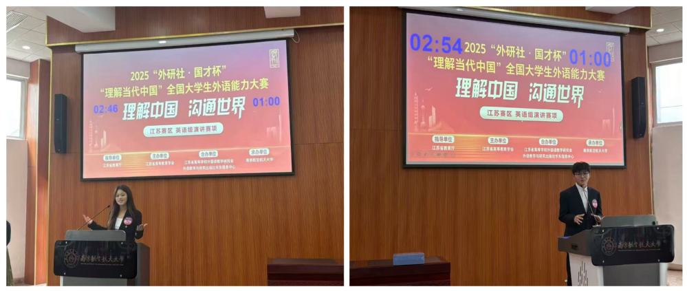 近日,2025年“外研社·国才杯”“理解当代中国”全国大学生外语能力大赛江苏赛区演讲赛项评选结果揭晓。我院精心选拔并派出的2名参赛选手,凭借出色的语言表达能力和扎实的思辨功底,在与省内70余所高校选派的173名包含英语专业的本科生及研究生的激烈竞争中脱颖而出,分别荣获江苏省二等奖和三等奖。我院选手的获奖人数及获奖比例在省内同类院校中并列第一,再次彰显了我院人才培养的显著成效。