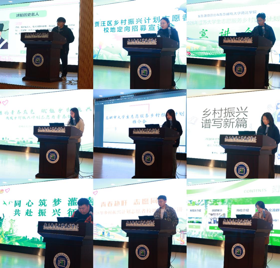 4月8日下午,2026年“江苏大学生志愿服务乡村振兴计划”校地定向宣讲会在我院实验楼报告厅顺利举办。学院党委副书记兼副院长刘伟、宿豫区团委副书记衡奕龙、高邮市团委副书记吴瞳,大丰县团委副书记李琦,如东县团委副书记张天宇,贾汪区团委项目办主任王梦茹,淮安区团委青发部部长李春蓉,沭阳县团委七雄街道宣传统战科科长杨旭,盱眙县团委学少部负责人王国凡,灌南县团委社联部部长谢鑫以及江苏各区县相关人员出席。会议由学院学生团委副书记王玉玲主持,团委全体老师和毕业班师生代表参加本次会议。