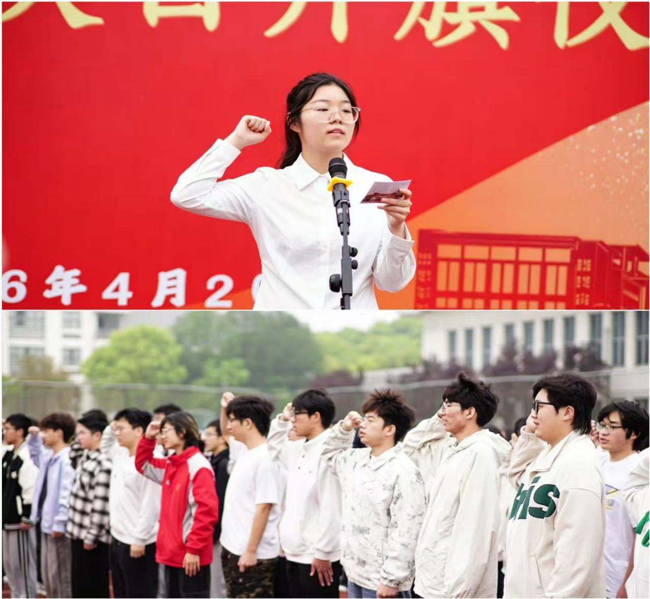国旗下,全体青年学子高举右拳,目光坚定,以掷地有声、铿锵有力的声音郑重宣誓。一句句誓言振奋人心、催人奋进,饱含着青年学子勤学笃行、求真向善的求学决心,彰显着强校有我、报国为荣的责任担当,承载着不负时代、不负韶华的青春追求。
