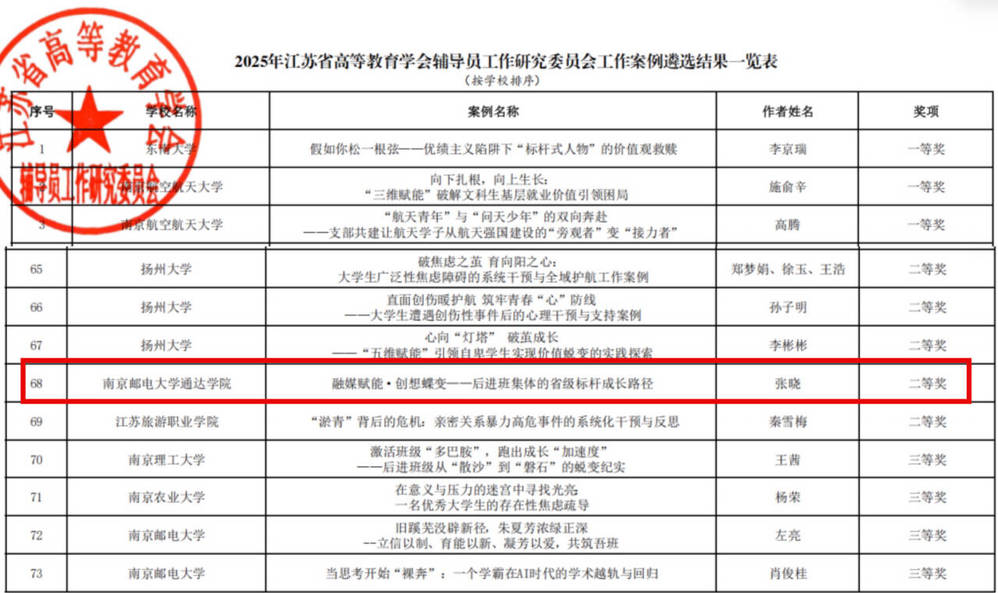 近日,江苏省高等教育学会辅导员工作研究委员会公布2025年度辅导员工作案例遴选结果,我院辅导员申报的工作案例喜获二等奖,全省独立学院中仅有2所院校获此奖项。