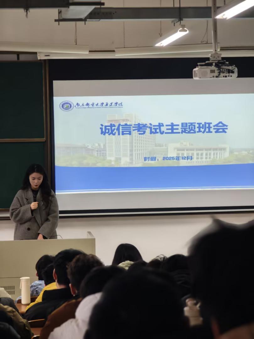 班会上,陈思涵老师首先结合当前学期期末考试即将来临的背景,阐述了诚信做人、诚信求学的重要性。她指出,诚信是中华民族的传统美德,是社会主义核心价值观的个人层面要求,更是大学生立身处世、成长成才的基本准则。考试不仅是检验学习成果的重要手段,更是对个人品德与自律精神的一次严肃考验。维护考试公平,就是维护学术尊严,守护个人信誉。随后,陈思涵老师带领同学们认真学习了《学生手册》中关于考试纪律和违纪处分的相关规定,通过详实的条款解读和具体的案例分析,清晰阐明了考试违规作弊的严重性及其可能带来的严重后果。她强调,学院对考试舞弊行为始终坚持“零容忍”态度,希望同学们切勿心存侥幸,以身试法。