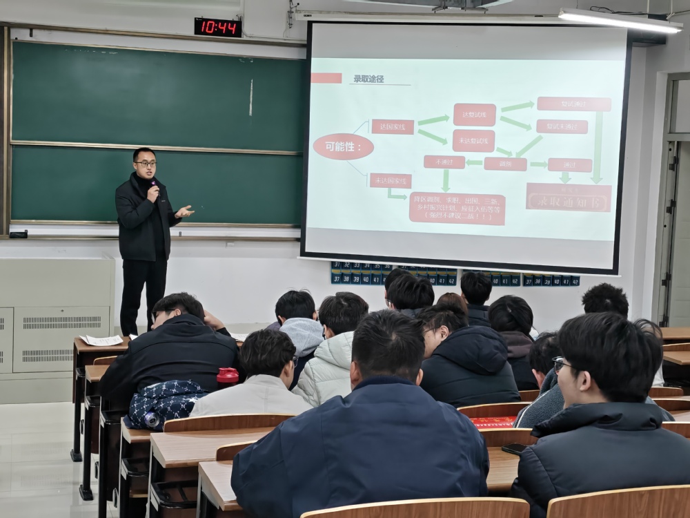 为帮助2022级学生更好地备战考研复试与调剂,明晰备考方向,提升应试能力,3月11日,学院举办了2026届考研复试交流会。会议由2022级辅导员何婷老师主持,党总支副书记范胜雪老师、分团委书记刘阳老师主讲,2022级全体考研学生参加。