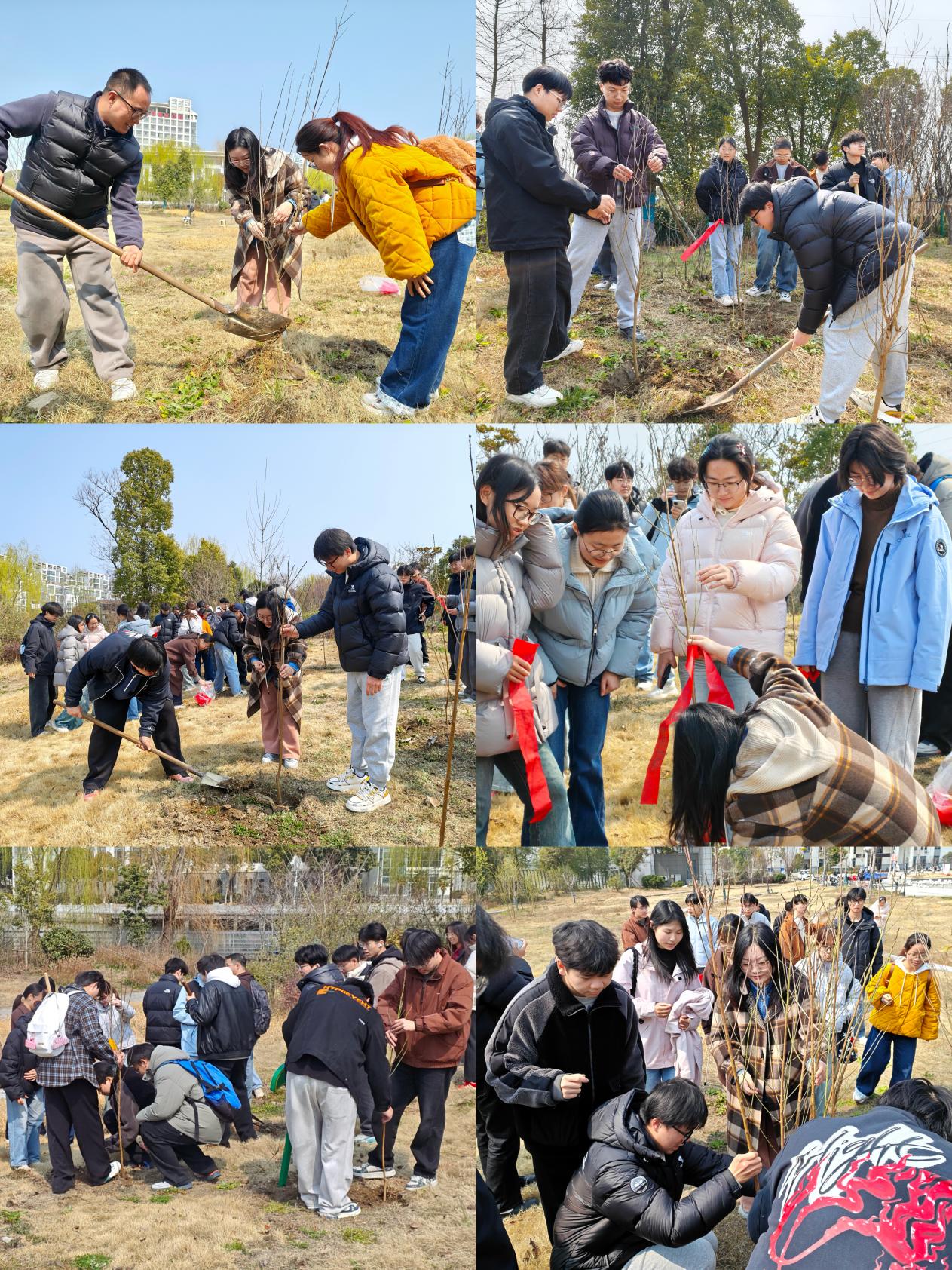 在植树间隙,同学们还精心准备了红丝带,认真写下新学期的目标、心愿与青春寄语。大家将一条条承载着理想、期盼与祝福的红丝带系在树枝上,让心愿与树苗相伴,让青春与绿意同行,共同在春风中茁壮成长。
