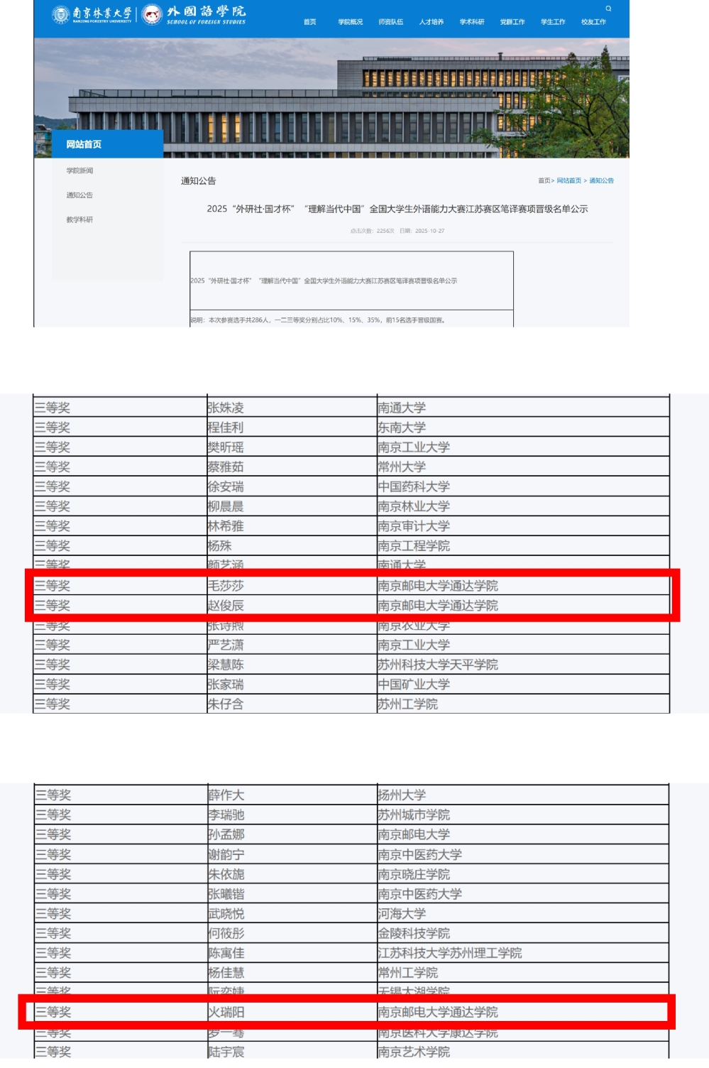 近日,2025年“外研社·国才杯”“理解当代中国”全国大学生外语能力大赛江苏赛区笔译赛项评选结果揭晓。我院精心选拔并派出的4名参赛选手,凭借扎实的语言功底、深厚的文化素养和出色的翻译能力,在与省内70余所高校选派的286名包含英语专业的本科生及研究生的激烈竞争中脱颖而出。其中3名选手荣获省级三等奖的好成绩,在笔译赛项中取得突破。我院选手的获奖人数及获奖比例在省内同类院校中排名第二,再次彰显了我院人才培养的显著成效。