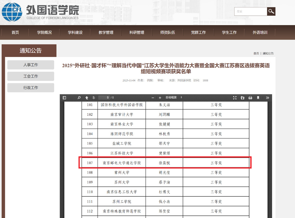 近日,2025“外研社·国才杯”“理解当代中国”全国大学生外语能力大赛江苏赛区英语组短视频赛项评选结果揭晓。我院精心选拔的2位参赛选手首次参与英语组短视频赛项的比赛,与众多英语专业的学生同台竞技,其中一名选手荣获省级三等奖的好成绩,实现了我院在短视频赛项中零的突破。