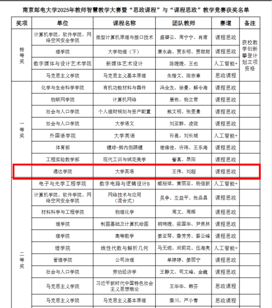 12月3日下午,南京邮电大学教师智慧教学大赛暨“思政课程”与“课程思政”教学竞赛决赛在仙林校区举办。本次教学竞赛以团队形式参赛,分初赛和决赛两个环节。依据比赛规则,经专家组集体评审,共评出特等奖获奖团队4组,一等奖获奖团队8组,二等奖获奖团队13组。我部外语教研室团队荣获一等奖!