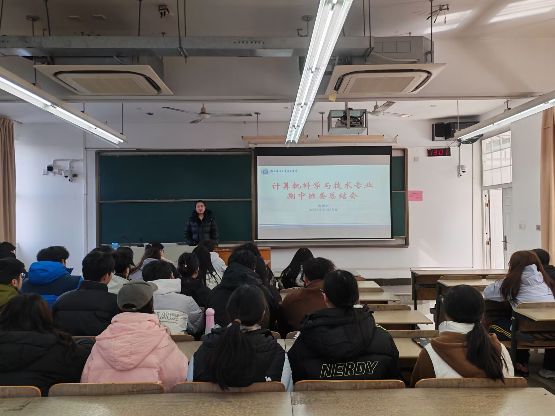 11月18日中午,2025级计算机科学与技术专业于扬教2217教室召开期中班委总结会,会议由辅导员靳薇弘主持,专业全体班委参加。