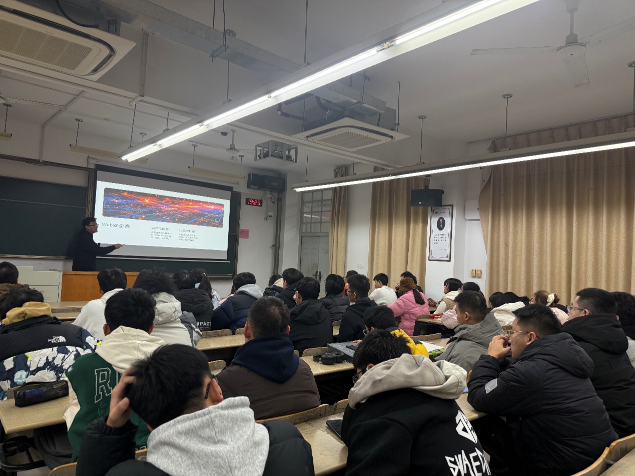 讲座中,孔瑞鹏从CTF基本概念切入,介绍了这一网络安全技术竞技赛事的起源与意义,强调此赛事在提升技术能力、增强团队协作和培养安全意识方面的重要作用。随后,他详细讲解了Web安全赛、逆向工程赛等主要比赛类型,分享了信息收集、漏洞挖掘、密码分析等实用解题技巧,并结合常见网络攻击案例,普及了数据加密、系统防护等安全知识。互动环节中,他耐心解答新生疑问,结合自身经验给出学习建议,鼓励大家积极参与实践,夯实专业基础。