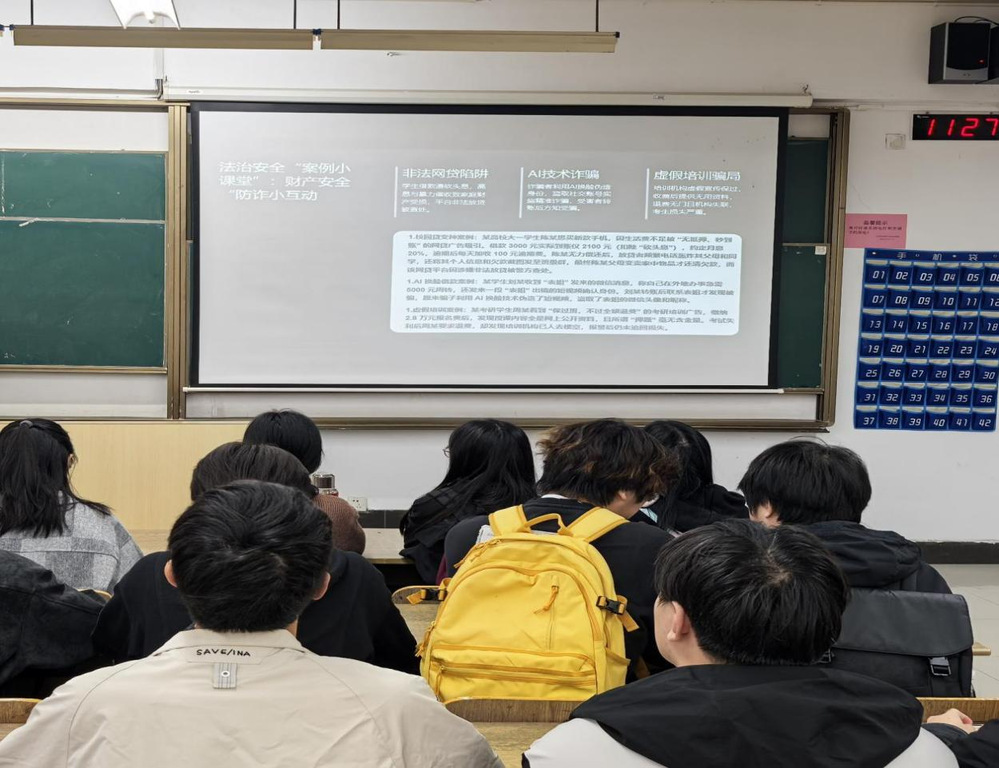 班委针对校园贷变种、AI换脸借款等新型诈骗手段,提前给同学们推送了相关图文资料,互动现场针对“遇到 AI 换脸借钱该怎么办?”“校园贷的隐藏陷阱有哪些?” 等问题进行提问,最后重点强调“不轻信、不透露、不转账” 的防诈“三不原则”。趣味十足的互动形式,让同学们在轻松氛围中掌握了识别和防范新型诈骗的要点。