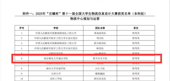 我院由朱辉、刘俊、束月月三位老师指导的三个参赛团队获全国特等奖、一等奖和二等奖,其中一个团队排名全国第六。本次大赛我院共派出了商学院2023级物流管理专业的9名学生组成三支队伍参赛,通过规划设计、仿真建模、对抗经营操作技能三项考核的激烈角逐,三个团队均获得优异的成绩。