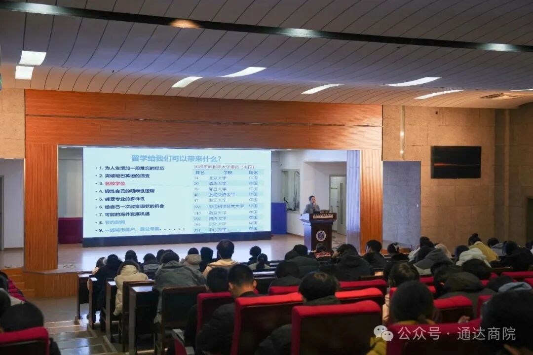 讲座伊始,于璟燚老师于璟燚老师结合自身留学经历,全面解读考研形势、留学动态及双轨准备策略,围绕考研与留学两大核心升学方向展开分享,系统梳理国内外读研的核心差异,包括考试标准、报考数量、学习时长等;同时介绍留学带来的优势,如名校学位、难忘经历、时间节约、海外发展机遇等。据于璟燚老师介绍,通达学院2024届毕业生留学成果丰硕,录取院校涵盖英、美、澳、马等多个国家和地区,充分彰显了留学路径的可行性。