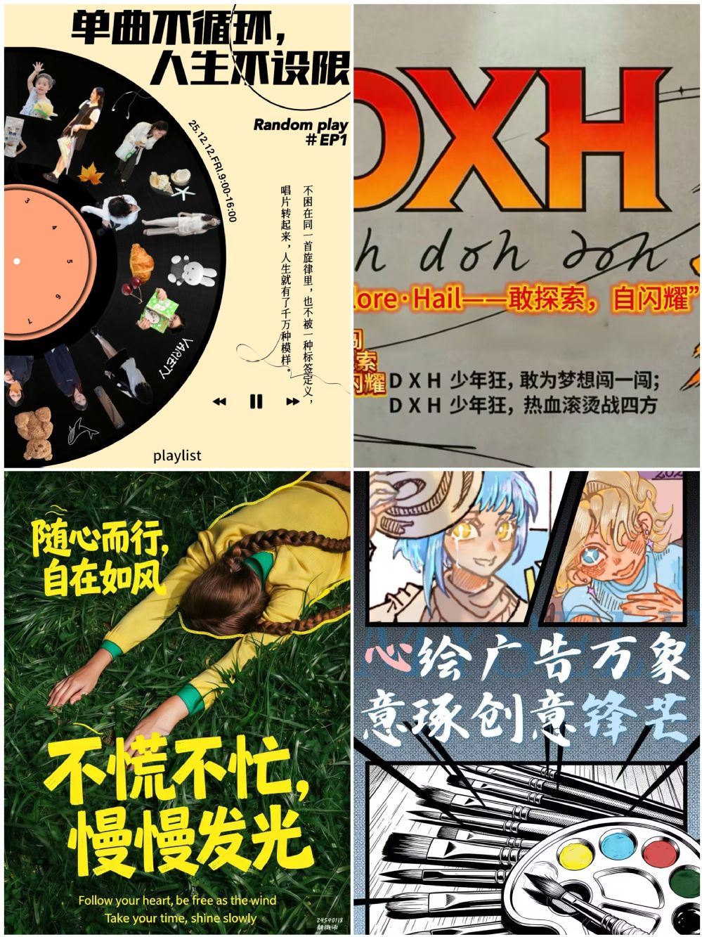 “为自己代言”专业创意实践活动立足学科特色,赋能学以致用。金融工程专业学子以专业视角提炼个人特质,用简洁slogan诠释素养追求;广告学专业学子融合设计与策划知识,将slogan与创意构图结合,打造特色平面作品。最终评出一等奖一项、二等奖两项、三等奖两项。活动以“以赛促学、以创促优”为导向,打破理论与实践壁垒,强化学子专业认同感与创新能力,为学风建设注入鲜活动能。