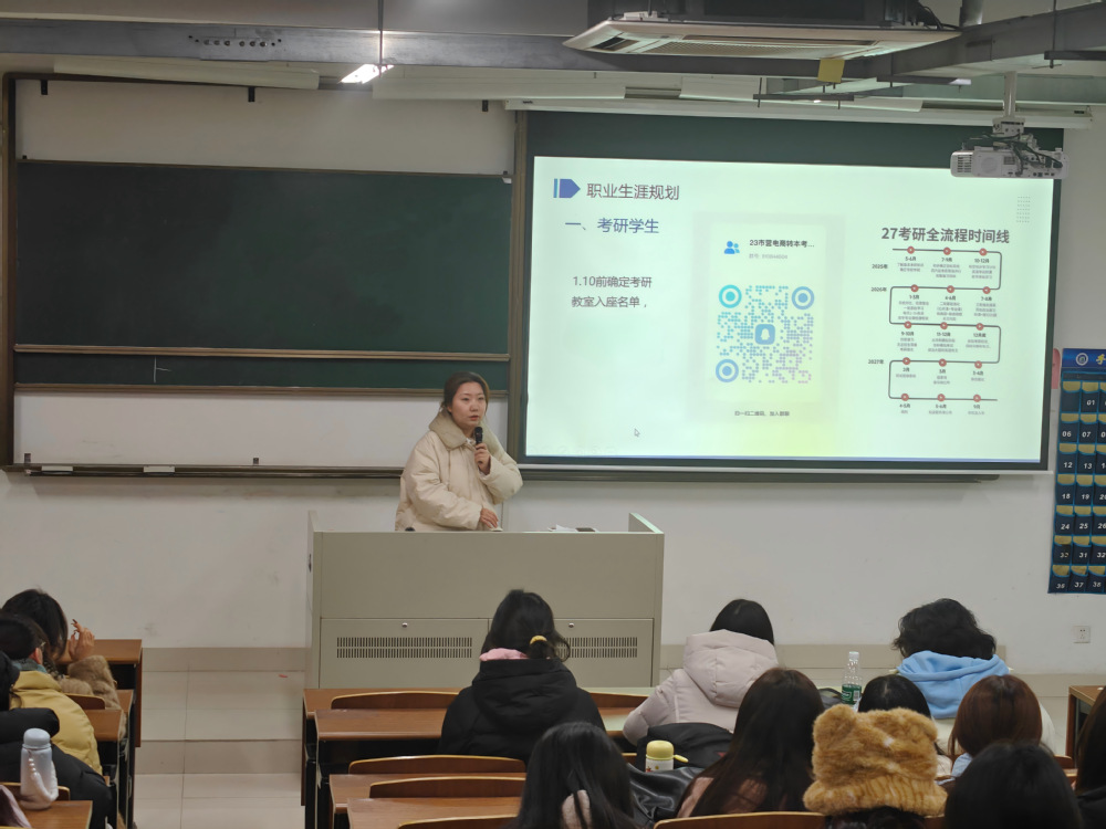 针对大三学生面临的关键抉择节点,朱亚茹老师围绕未来主要发展方向,给出了条理清晰的指导建议与明确的时间规划节点。针对有考研意向的同学,朱老师系统梳理了考研复习全周期时间线,同时提醒同学们选择考研教室,提高备考效率;针对就业的同学,朱老师着重介绍学院官方信息获取渠道,引导大家通过“南京邮电大学通达学院”官方网站,自主查询校内招聘会时间、地点及来访企业详情等关键信息。