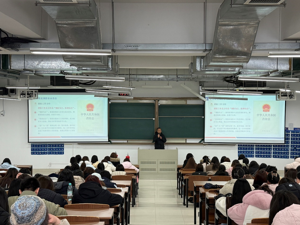 讲座现场,苗老师结合真实火灾案例视频,直观展示了火灾发生时的迅猛态势与严重危害,让在场学生深刻认识到消防安全的重要性。随后,他围绕科学疏散逃生技巧展开详细讲解,明确引导学生:面对小火应迅速沿疏散楼梯有序撤离,切勿贪恋财物;遇浓烟围困时,需立即关门堵缝、固守待援,及时拨打求救电话,坚决杜绝乘坐电梯、盲目跳楼等错误逃生行为,切实掌握“懂逃生、会自救”的消防技能。