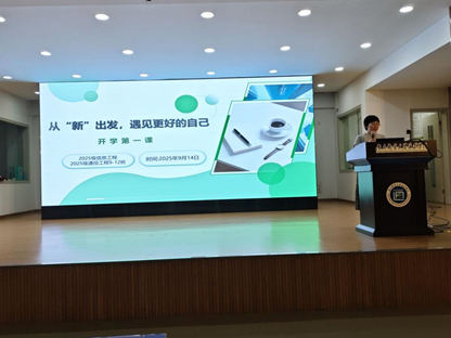 9月14日晚,2025级信息工程专业、通信工程专业9-12班在实验楼报告厅成功召开“开学第一课”主题班会。会议由通信工程学院党总支书记兼辅导员司艺主持,专业全体同学参加。班会以“从‘新’出发,遇见更好的自己”为主题正式开启大学成长新旅程,共同翻开人生崭新篇章。。
