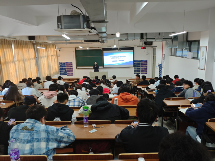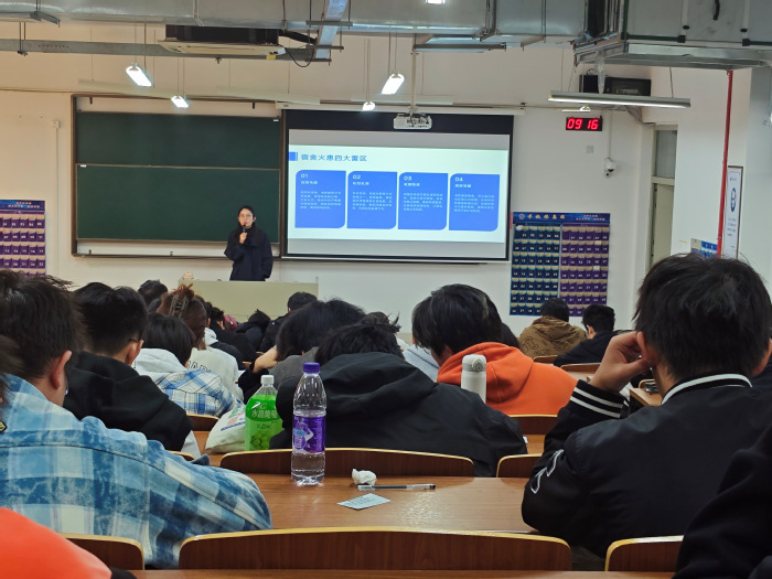 徐老师,以 “身边事” 为切入点,结合近期高校安全案例,让抽象的安全知识变得具体可感:在消防安全环节,她通过图片对比展示了宿舍违规使用 “热得快” 引发短路的场景,现场演示灭火器 “提、拔、握、压” 操作步骤,强调 “小火及时处置、大火迅速逃生” 的应急原则;针对高发的电信诈骗,播放了校园贷、刷单返利的警示视频,拆解 “冒充客服索要验证码”“游戏账号虚假交易” 等诈骗套路,并总结 “不轻信、不透露、不转账” 的 “三不原则”。宿舍安全与交通安全环节则更贴近学生日常。徐老师结合宿舍安全检查中发现的问题,提醒同学们 “离开宿舍务必关电锁门,不私拉电线、不存放贵重物品”,并现场发起 “宿舍安全承诺” 倡议;针对校园周边骑行、出行安全,通过模拟 “低头看手机过马路”“电动车逆行” 等危险场景,强调 “佩戴头盔、遵守信号灯、拒绝黑车” 的重要性,呼吁同学们养成良好出行习惯。此外,网络安全板块还针对 “个人信息泄露”“网络谣言传播” 等问题,引导学生树立 “文明上网、理性发言” 意识,学会辨别不良网络内容,保护自身权益。