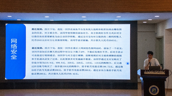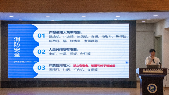 在消防安全方面,唐老师从《学生手册》相关条例出发,明确划定宿舍安全红线:严禁使用洗衣机、热得快、煮蛋器等大功率电器,强调“人走关闭电灯、空调、插板”的用电习惯,禁止在宿舍、楼道及教学楼使用明火(如抽烟、酒精灯等)。网络安全反面,唐老师则以真实案例为切入点,让学生直观感受网络诈骗风险,提升警惕性。交通安全方面,强调“佩戴头盔、遵守信号灯、拒绝黑车”的重要性,呼吁同学们养成良好出行习惯。心理健康方面,唐老师再次向全体学生展示心理健康教育中心的咨询值班安排以及江苏省大学生24小时心理热线等,引导同学们重视心理健康,积极寻求专业人员的帮助。