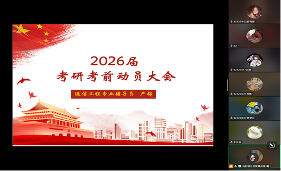 为帮助大四考研学子调整心态、明晰注意事项,确保考研初试顺利进行,2022级通信工程专业于12月17日晚召开线上考研考前动员大会,会议由辅导员严棉老师主持,专业全体考研同学参会。