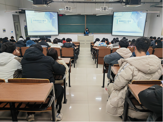 会上,严老师重点强调了交通出行安全,提醒学生选择正规交通工具,全程系好安全带,避免乘坐无资质车辆。严老师针对寒假返乡及出行途中的生命与财产安全、消防安全等内容进行了详细讲解,列举电信诈骗、宿舍用电隐患等典型案例,引导学生提高防范意识。
