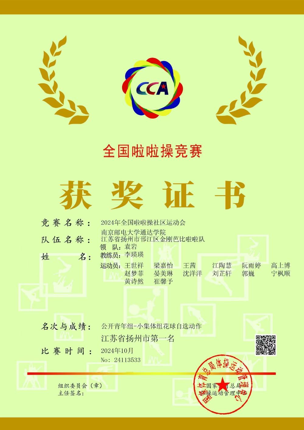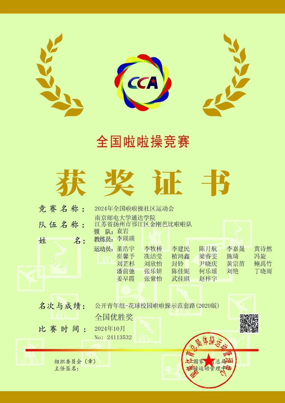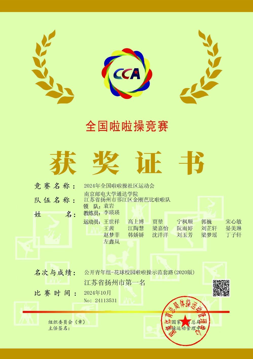 近日,我院啦啦操代表队传来捷报,在2024年全国啦啦操社区运动会上取得花球校园啦啦操示范套路公开青年组江苏省扬州市第一名、全国优胜奖,小集体组花球自选动作公开青年组江苏省扬州市第一名、江苏省第三名佳绩。