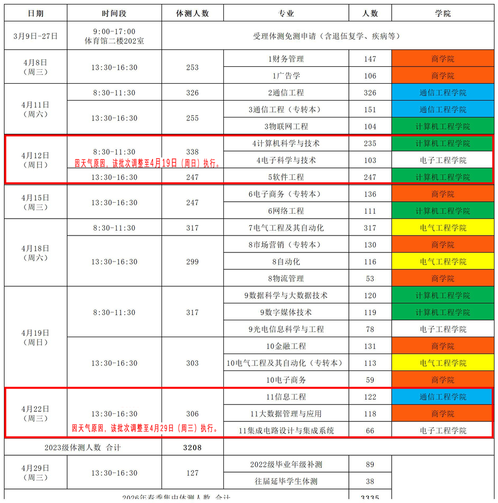 为贯彻落实教育部关于学生体质健康标准的相关文件精神,遵照《南京邮电大学通达学院体质测试管理办法》,做好我院学生的体质健康标准测试工作,计划于4月组织开展2026年春季学生集中体质健康测试工作。请相关部门做好准备,相关辅导员老师及时通知到学生参加体质健康测试,并将测试安排及注意事项告知学生。